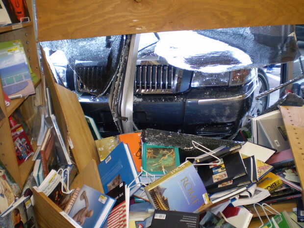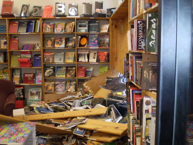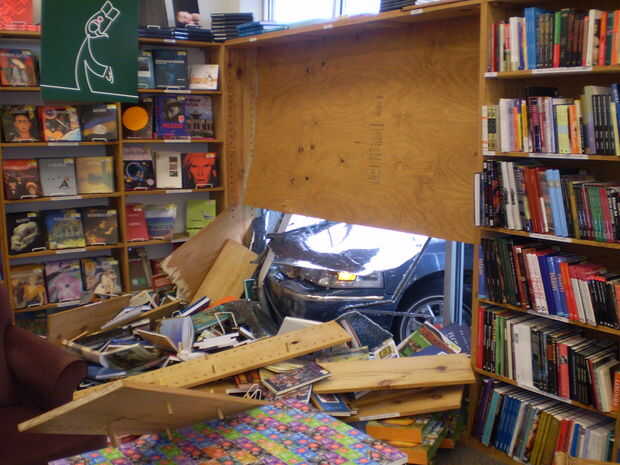 Los estantes cayeron en él y se deslizó fuera de al lado y hay daños causados. Atribuyo esto a la tambaleante-ness. Además, es bastante robusto y corto, y creo que ayudó a no conseguir machacado. ;)