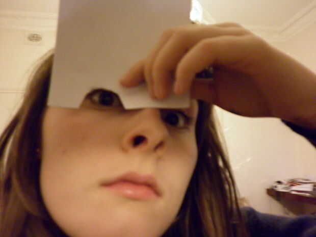 Recórtalo y usar un espejo para ver lo buenos que son tus habilidades que conjetura. (Ignorar mi cara divertida o utilizarlo como modelo y crear su propio). Me pareció que mi arco demasiado profundo así que corte es hacia abajo por cerca de un tercio. Enjuague y repita hasta que tenga una forma realizable que se siente como podría ser cómoda.