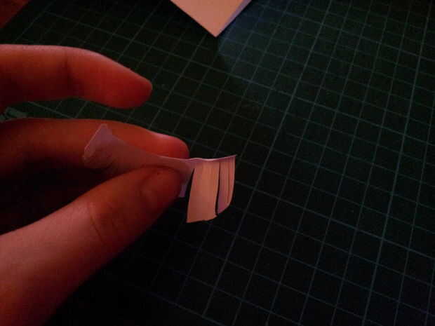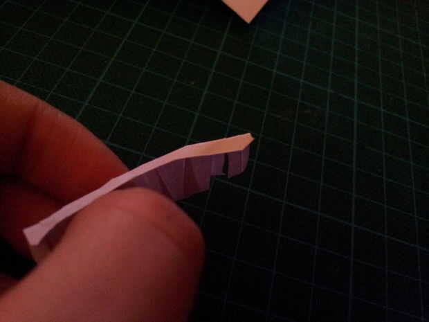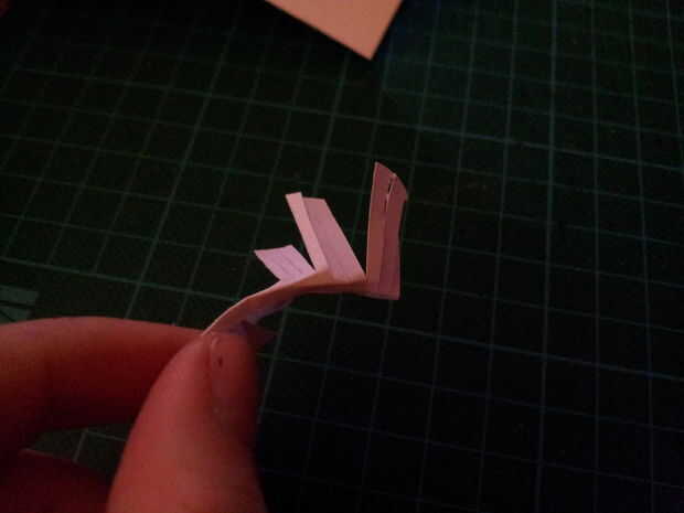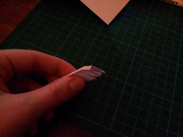 Para hacer esto simplemente solía el mango cilíndrico de mi cuchillo X-acto como base curva las pestañas alrededor. Hacer esto en secciones. Si la curva es a grande o pequeña usar cilindros más grandes o más pequeños para crear diversos tamaños. Algo con un borde afilado será probablemente el mejor.