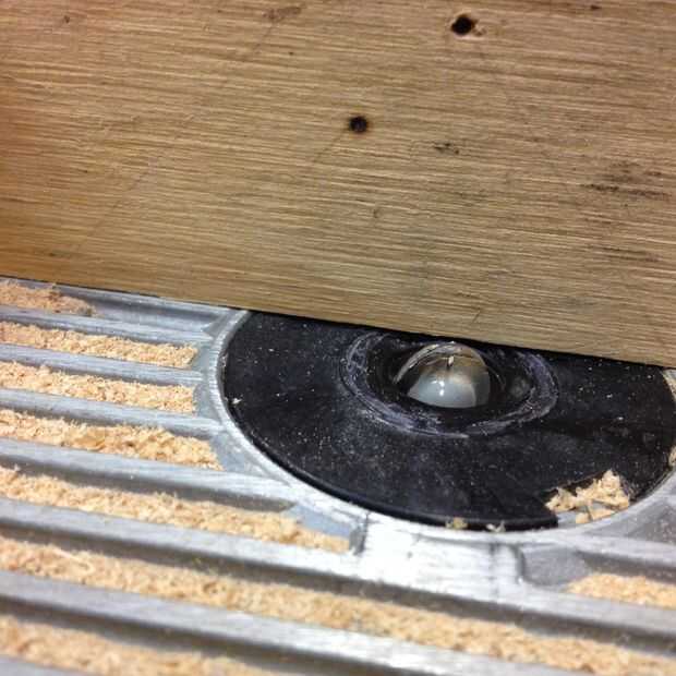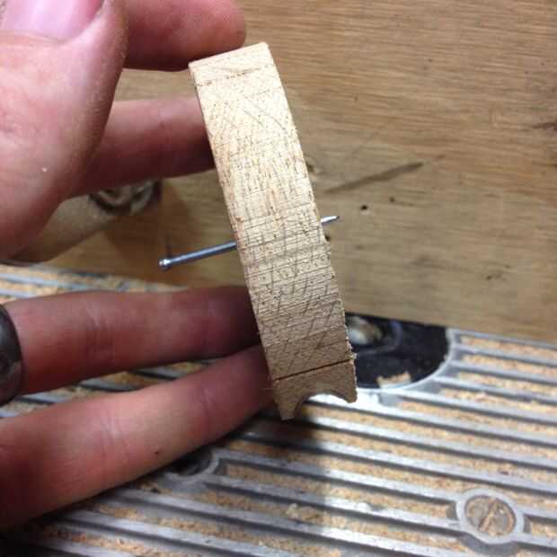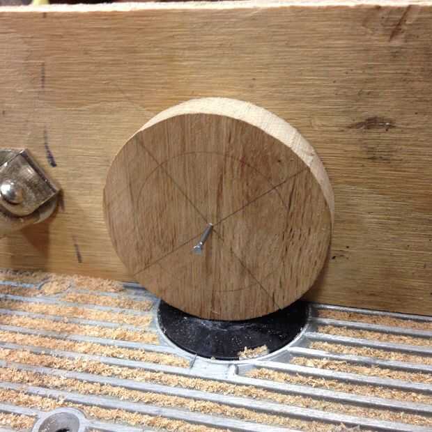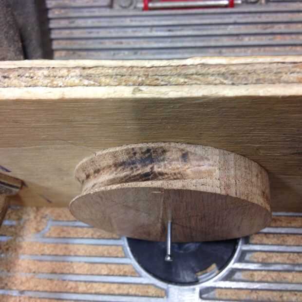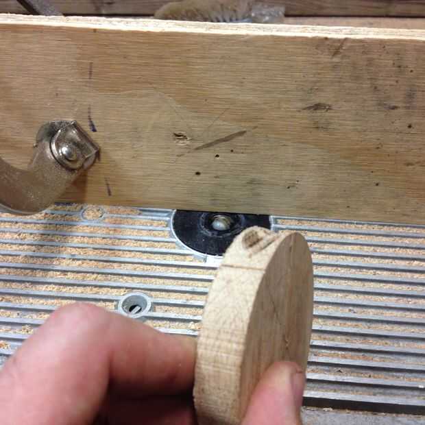 Usé una cala 1/2" broca sobre mi mesa de la fresadora para cortar un surco alrededor de la circunferencia del eje. Coloca un tope-guía auxiliar para que la Cala centrada en el borde del cubo. Corté una cala en una sección del eje. Con el router apagado, coloque el espacio en blanco directamente sobre la broca y transferencia de la marca y perfore un agujero de pivote en la cerca. Utilice el mismo clavo como antes para hacer girar el espacio en blanco y cortar una ranura alrededor del blanco. Mi granito de arena de Cala no fue la más aguda y el roble es bastante difícil, así que tengo algunas marcas de quemaduras. Puede enarenar hacia fuera si lo desea, pero te haz cubiertos para arriba de todos modos.