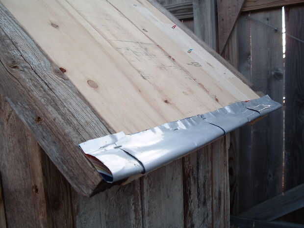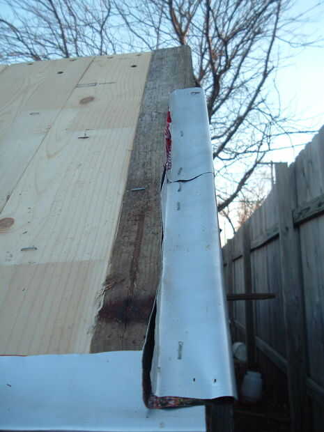 Sueltamente el doble los rectángulos de aluminio por la mitad y les grapa traslapo en los bordes inferior y lateral del techo. En los bordes laterales, hacer una pequeña curva 90 de las tejas enganchar en; ver la imagen. Asegúrese de que la coincidencia es correcta en los bordes laterales de goteo.