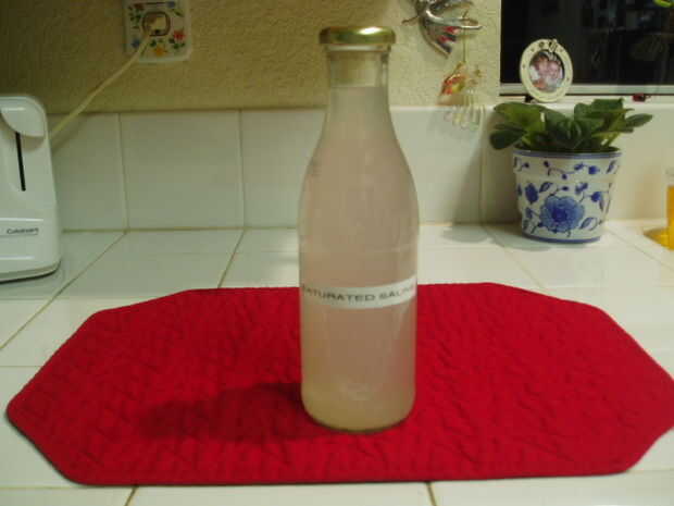 Siguiendo los pasos descritos en la fabricación de una solución salina o hidróxido solución preparar 500 ml (aproximadamente dos tazas) de una solución salina saturada usando agua destilada agua en lugar de agua del grifo.