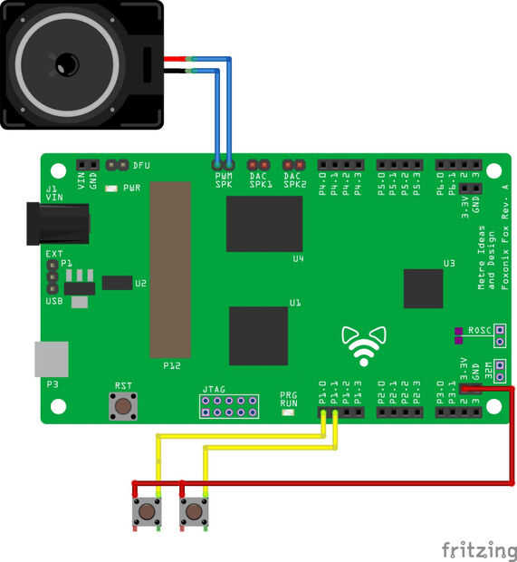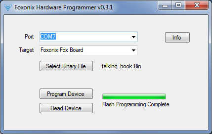 Para probar el programa existente (Donde el salvaje las cosas son) con el hardware antes de realizar cambios, use el Zorro Hardware programador para cargar el archivo talking_book.bin en la Junta de desarrollo de Fox. Después de carga el programa, debe ser capaz de pulsar los botones y escuchar las páginas que se leen.