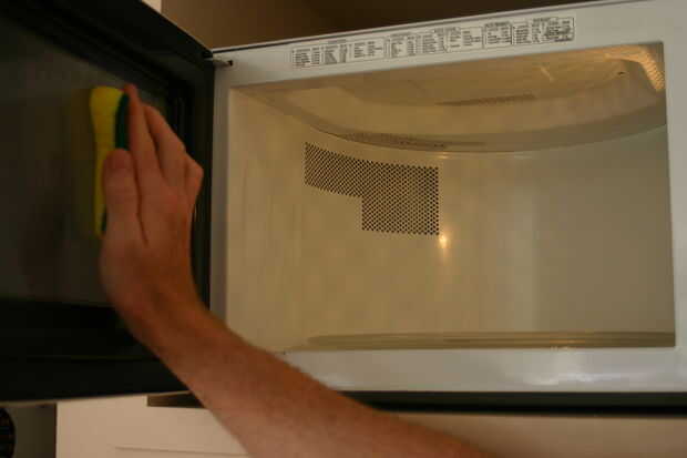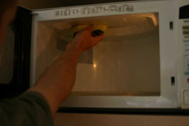 Después de cocinar con microondas el jugo, debe ser una agradable capa de humedad de jugos calientes en el interior del microondas. Use la esponja para limpiar el interior del microondas. No te olvides de limpiar la puerta y debajo de la placa giratoria. Se puede utilizar la esponja mojada ahora para limpiar el exterior del microondas.