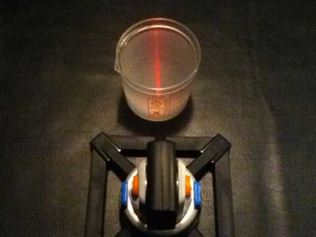Usted necesitará un cuentagotas con una pequeña cantidad de leche, una cucharadita y un vaso de precipitado con 250 ml de agua. Exprimir unas gotas de leche del cuentagotas en el vaso y mezclar. Brillar el láser a través del vaso y ahora podrá observar el efecto de Tyndall.
