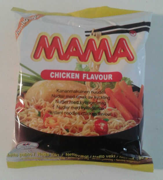 Uso pollo con sabor instantánea de fideos de la marca Mama, el paquete "jumbo" para ser exactos. Su peso neto es 90 gramos, o aproximadamente 3,17 onzas si estás en ese tipo de cosas, y cuesta 0,69 euros o 0,94 dólares. Si usted está interesado, vivo en Finlandia donde estas y otras marcas de fábrica de tallarines inmediatos se están convirtiendo en cada vez más común.