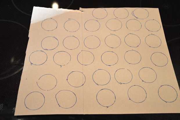 Llenar la mezcla recién generada en una manga pastelera. Coloque una hoja de papel en una de las bandejas de hornear. Utilizando el lápiz, dibujar 40 círculos del mismo tamaño en una hoja de cartón. Puede utilizar un vaso de chupito como plantilla, porque se trata del tamaño de que los macarrones será más tarde. Coloque esta hoja de cartulina por debajo el papel del forro. Ahora toma la Manga pastelera y coloca la masa en los círculos predefinidos. Deje la masa durante unos 30 minutos a temperatura ambiente. Repita el mismo procedimiento en otra bandeja de horno. En total debe han hecho 80 piezas circulares de masa.