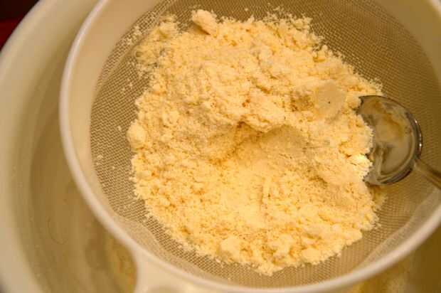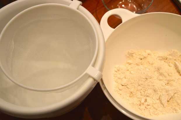 Una vez hecho esto, tome el tamiz y recorren lo 200g de almendras y los 200g de azúcar en polvo. Esto se asegurará de que no hay trozos de almendras o azúcar se incluirán en los macarrones.