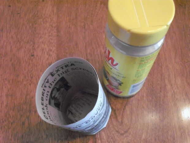 he comprado un "Pot Maker" (Tm) de un catálogo de semillas para hacer macetas de periódico. Es genial pero cortando tiras de papel es tedioso por lo que me ocurrió con esta técnica. Encontré un trozo de PVC de 3/4" con un codo en él y corta