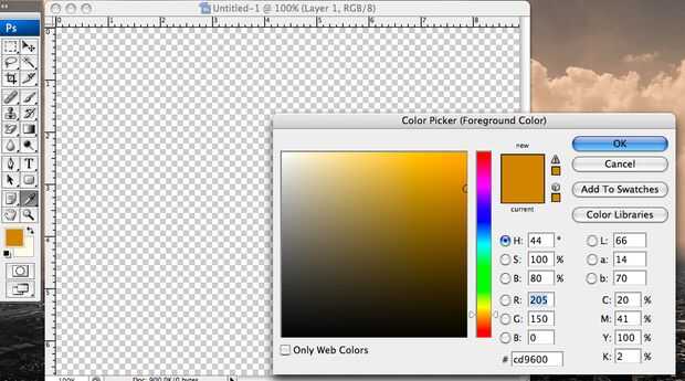 Tienes que llenar tu imagen en blanco con un color naranja amarronado. Los valores de mi color es R 205 G 150 B 0. Usted puede usar que o lo sientes como usar. Utilizar la herramienta Cubo de pintura para rellenar la imagen con color.