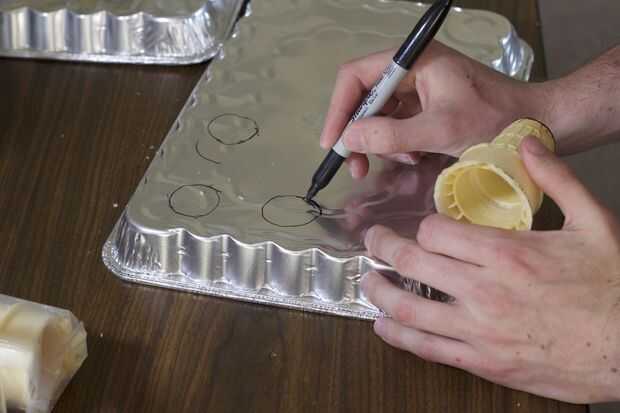 Tomar uno de sus conos y usando un rotulador u otro utensilio de marca, rastrear el fondo del cono en su bandeja de lata. Continuar todo trazado a través de la bandeja hasta que tienes un 4 x 3 red (depende del tamaño del pan).