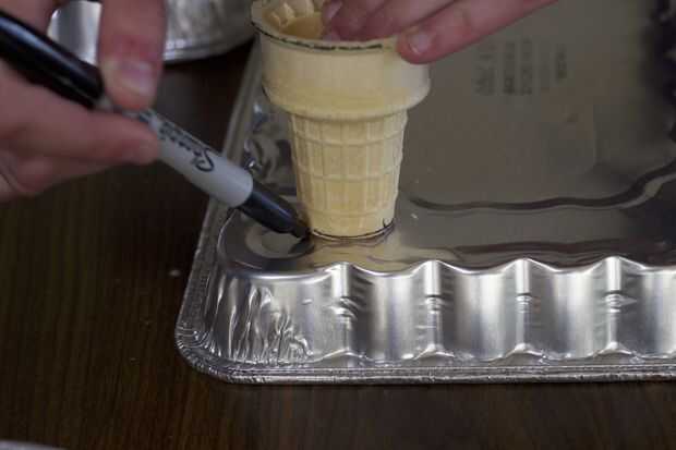 La primera vez que hice estas, llenaron mi helado anuncio conos di cuenta que no tenía ninguna pista cómo ponerlos en el horno. Ocasionalmente puede tener suerte y exprimir una tonelada de conos en un pie de plato por lo que no se mueva, pero tenía que haber una mejor manera.