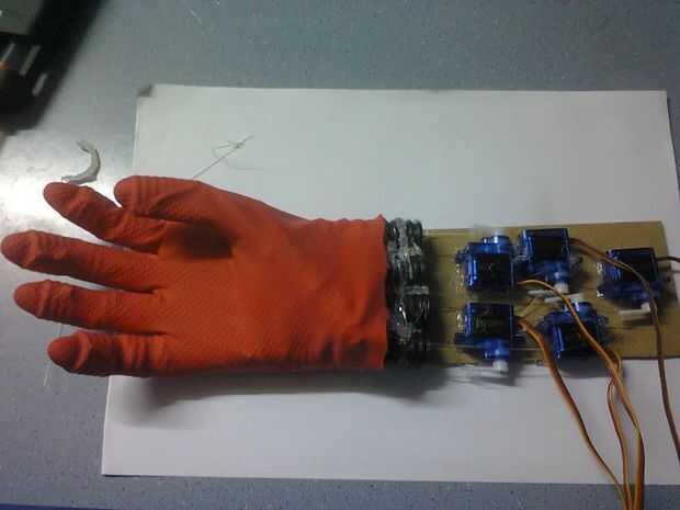 Colocación de las muñecas de la placa de robot, servo motores son se estabiliza en esta placa. Conectamos cada servo cable pesca de línea conectado a un dedo. Así, cuando el motor servo se tire hacia atrás el dedo.
