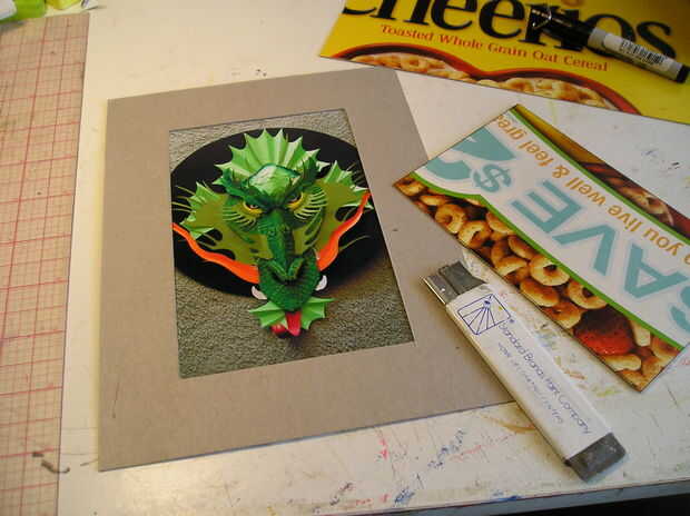 Marque y corte una abertura de la imagen, dependiendo del tamaño de tu impresión. Si es un 4 x 6, hacer la apertura de 7 3/8ths x 5 7/8ths. Así, algunos del marco traslapan la impresión.