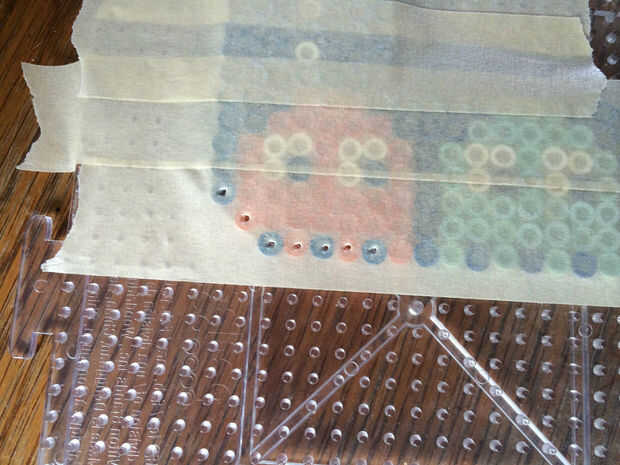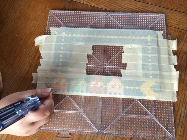 Una vez que el marco se graba completamente, tomar un objeto contundente (yo uso la parte trasera de un destornillador) y frotar sobre el marco así que todo es uniforme. Una vez hecho esto, tomar un objeto puntiagudo (como un lápiz afilado o punta de lápiz) y empujar los agujeros en la cinta para cada grano individual. Esto puede parecer tedioso, pero es importante ya que la cinta puede burbujear durante el planchado si este paso se hace incorrectamente o saltado.
