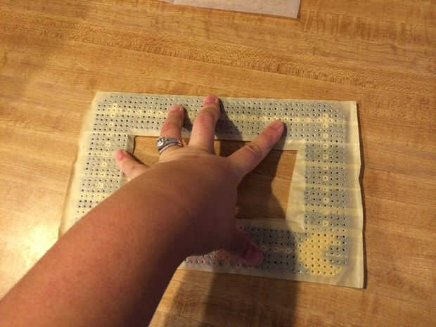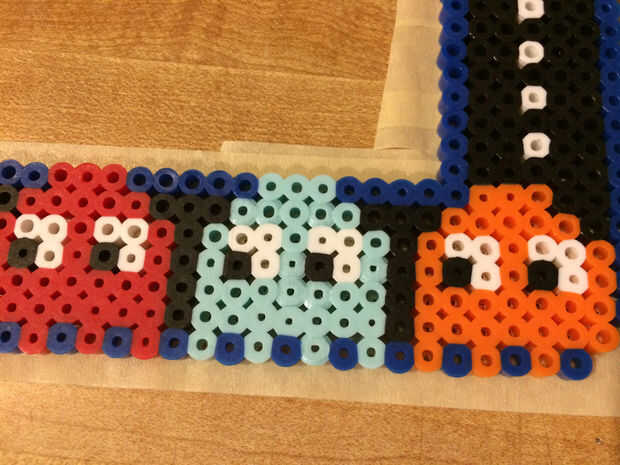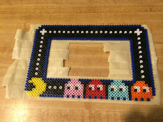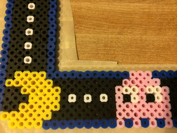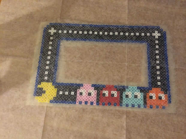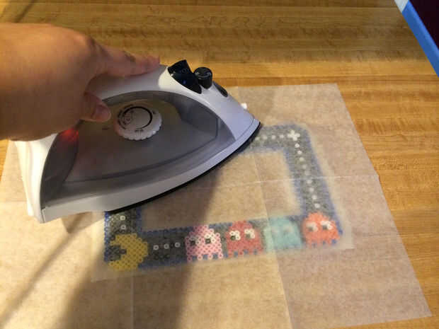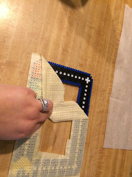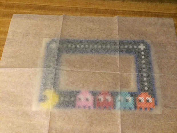 Sobre una superficie limpia, coloque el marco con el lado de la cinta hacia abajo y coloque papel pergamino en lado hacia arriba. Con una plancha ya caliente (en un medio caliente temperatura), pase la plancha por la totalidad del marco hasta que los granos se han fusionado. Algunas personas les gusta sus piezas de hierro hasta que los granos se funden completamente pero me gusta el aspecto pixelado más así que de hierro hasta que simplemente están fundidos juntos. Una vez que el marco esté frío al tacto, darle la vuelta y y cáscara retroceda muy lentamente la cinta adhesiva, asegurándose de que todos los granos se funden a medida que avanza.