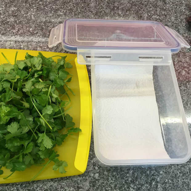 Lavado frondosas hierbas como cilantro y perejil y secar en un centrifugador de ensalada. Poner en un recipiente de plástico sobre una capa de papel absorbente y mantener en la ensalada de verduras. Esto también funciona para las ensaladas embolsadas. Dura varios días más que si la izquierda en la bolsa.