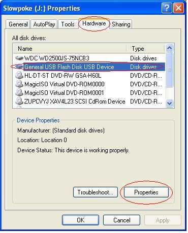 Ir de arriba a abajo, es decir hardware, haga clic en Seleccione la unidad Flash en la lista, haga clic en propiedades.
