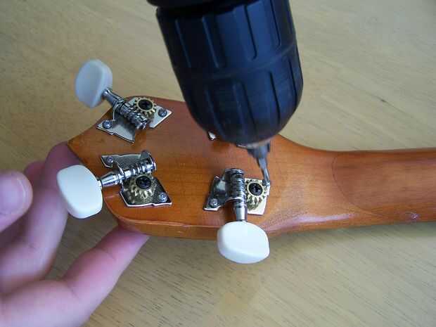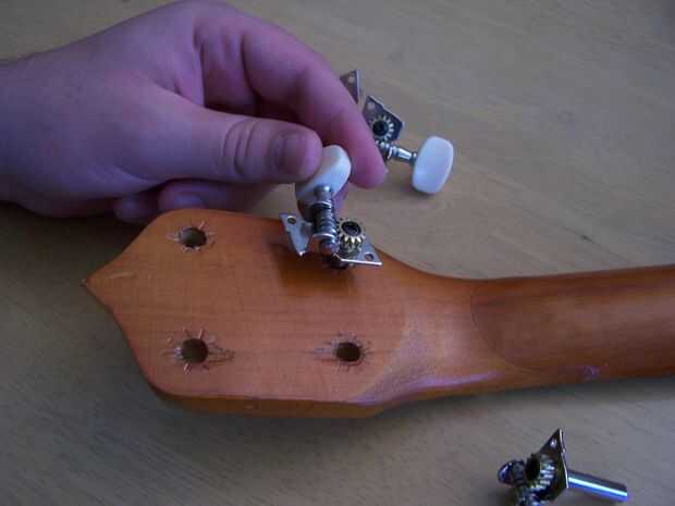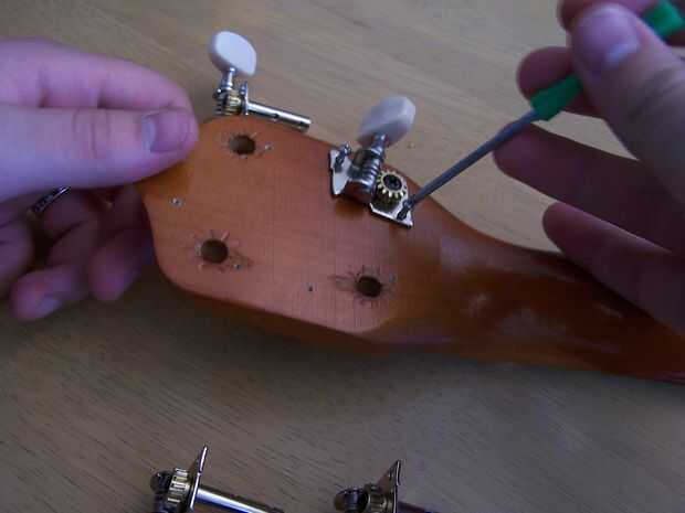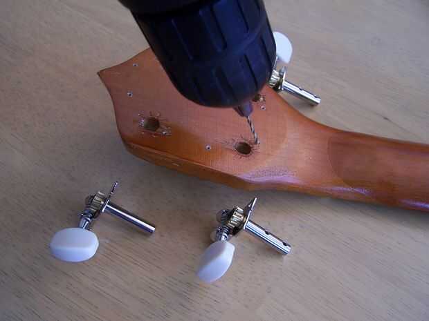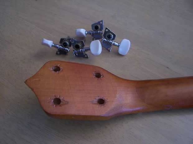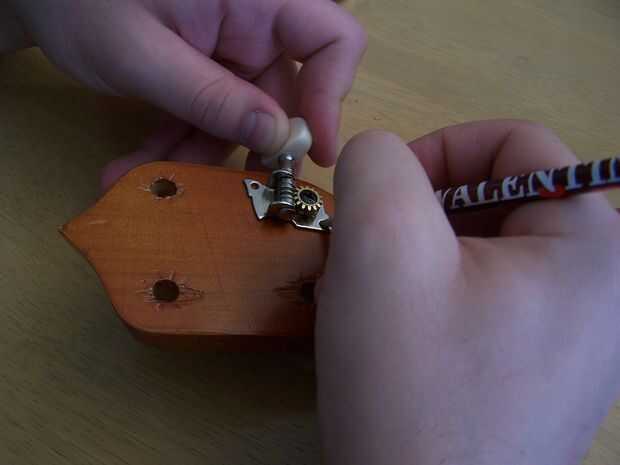 Lo primero que tienes que hacer es colocar las clavijas cómo quiere ser en la cabeza de lo Uke. Después de eso, toma el utensilio de marca (el mío es un lápiz) y marque los orificios en la cabeza donde se pondrán los tornillos de las clavijas de afinación.