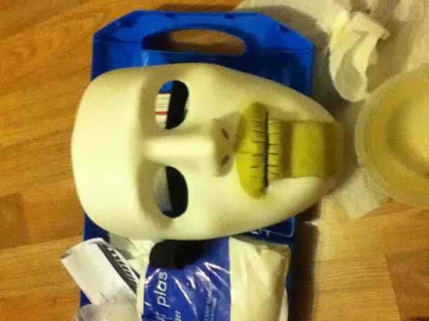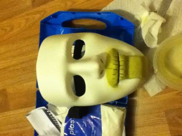Siga las instrucciones en el paquete de miliput y mezcle una cantidad que parece adecuada. Siempre es mejor que demasiado poco de la mezcla y luego añadir, que to demasiado la mezcla y el material de desecho. Trabajo con las manos mojadas, esto ayuda a Lisa abajo cualquier criado áreas o brechas que aparecen al esculpir. Aplicar el milliput firmemente para que tenga un buen agarre en la máscara base.