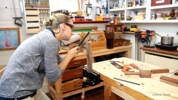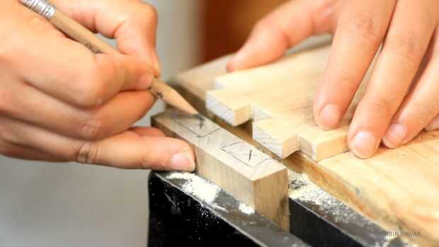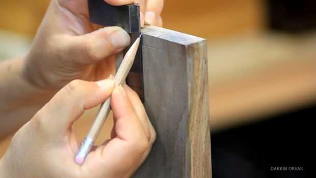 Ahora una vez hecha la tabla de colas, es el momento de pasar a la tabla de espigas. Así estoy ajuste de la nuez abajo de plano en la prensa, y estoy poniendo al arce en la parte superior, de trazado donde las clavijas tienen que.