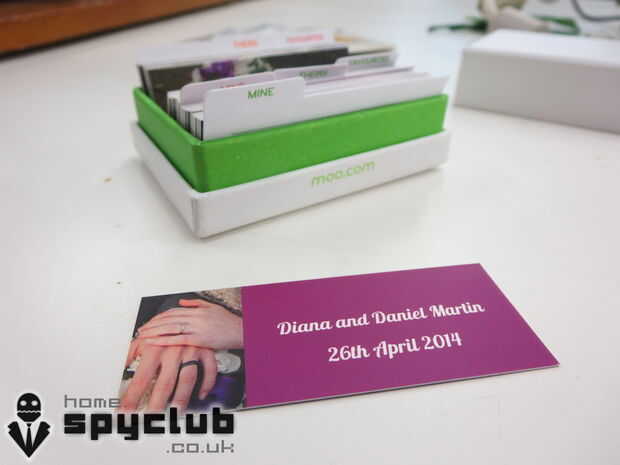 Decidí que en lugar de simplemente escoger una foto, me gustaría conseguir una carga de imágenes impresas para caber en el marco. Esto es donde me encontré con mini tarjetas de moo. Moo imprime tarjetas de visita donde un lado es lo mismo (así que poner nuestra fecha de boda para que nunca se me olvida nuestro aniversario) y en el otro lado puede imprimir cualquier fotografía que te gusta.