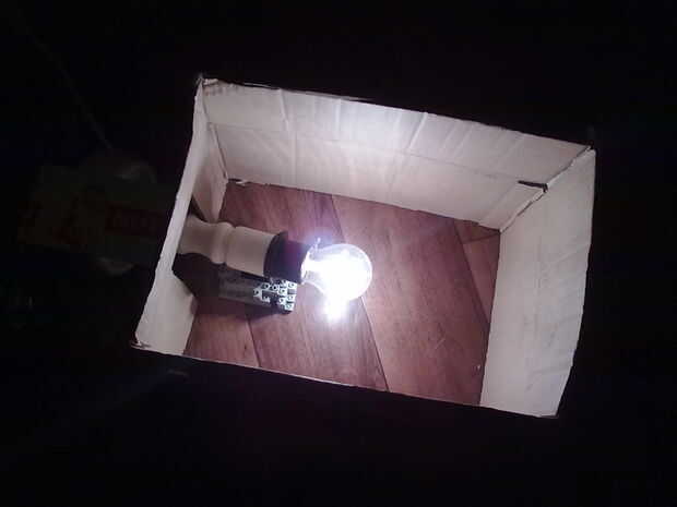 Segundo paso es poner una luz en la caja. Tengo este bombillo ordinario, pero se pueden utilizar muchas muchas cosas. Todo lo que hace la luz.