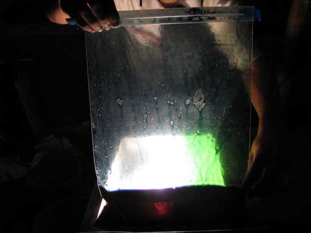 Lo último es opcional, pero es lo que hace que mi mesa se ve como se ve y that´s... LÁMINAS (u hojas? ¿qué llama?). Láminas de colores que se colocan debajo de la loseta de vidrio o debajo de la bolsa. Hacen una gran diferencia. La luz se extiende, mezcla de color en el agua y usted puede cambiarlo, convertirlo, forma, experimentar con él y hacer cosas locas.