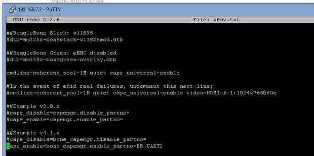 - Primero... borrar la marca de comentario "#" y añadir la selección UART2 BB después del último signo de igual.