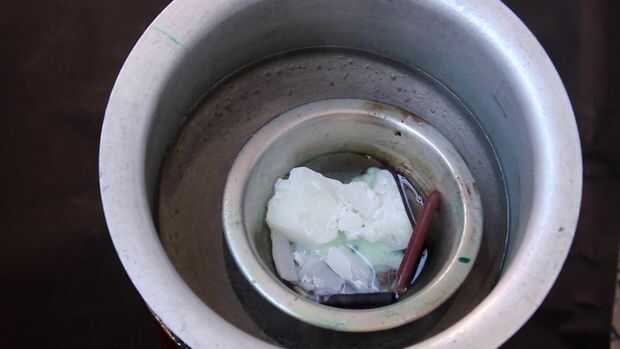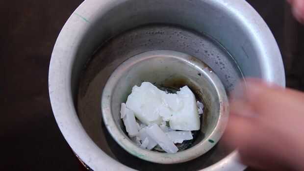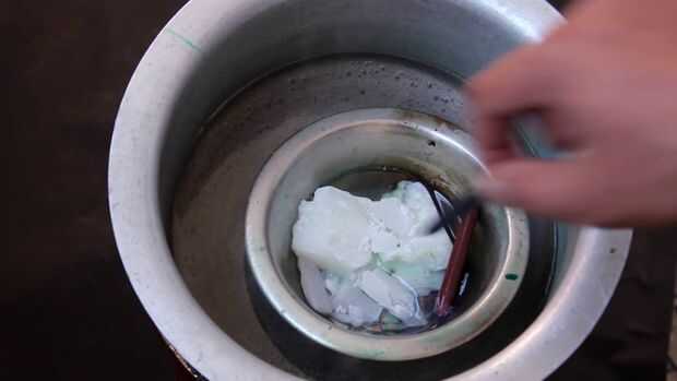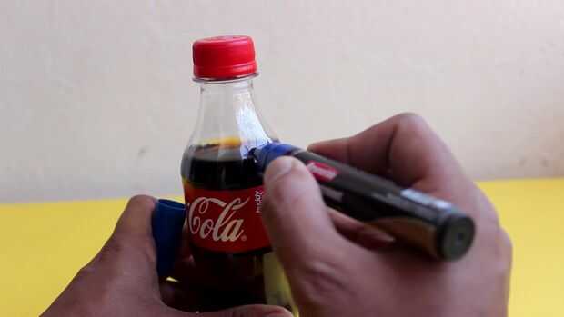 Marca la posición del líquido en la botella y el derretimiento de la cera en baño de agua caliente durante la fusión Añadir 1 marrón y 2 lápices negro para coca cola vela vela sprite usan 1 verde oscuro y un crayón verde luz, lápiz de cera se derrite y le dan color.