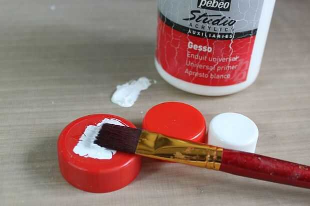 Elegir tres tapas de plástico en diferentes tamaños. Cubrir con dos capas de gesso o pintura acrílica blanca.