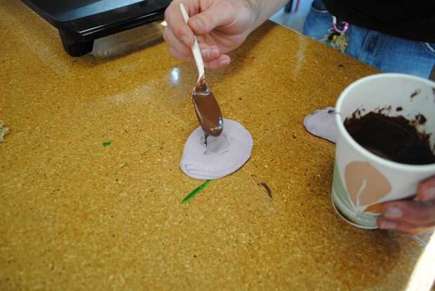 Ahora puede utilizar una cuchara o una brocha para colocar el chocolate en el molde. Vierta también trabajará para el molde más grande.