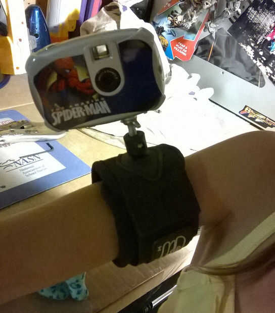 Bien entonces, el brazo banda cámara de montaje está acabado, y ahora puede conectar una cámara y bloquéelo con la tuerca de mariposa.