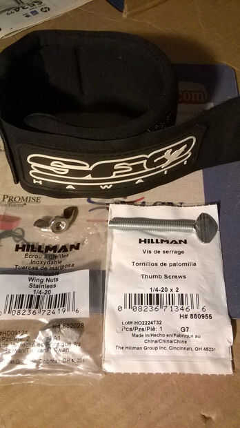 El tornillo y la tuerca de mariposa son 1/4-20 (hilo de diámetro) compra lo pulgadas largo usted necesidad o extra y corte la longitud excesiva ausente.