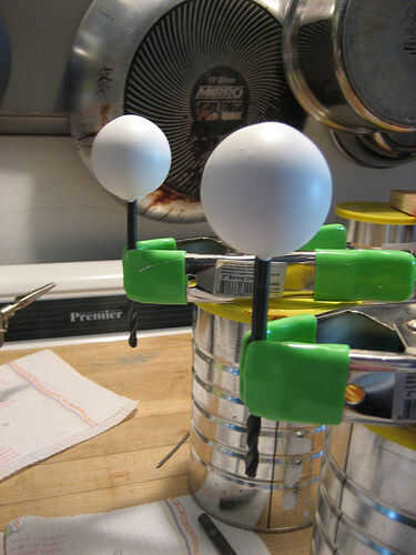 Este paso puede omitirse si empezaste con pelotas de sólido blanco ping pong, pero siento el caucho hace los ojos más rígido. Con el imán atado todavía al clavo (o puede utilizar uno de los pedacitos de taladro como yo lo hice), sumergir la bola en el blanco Plasti Dip. Debe hacer una capa. Dejar completamente seco.