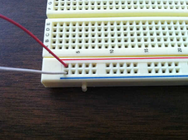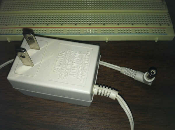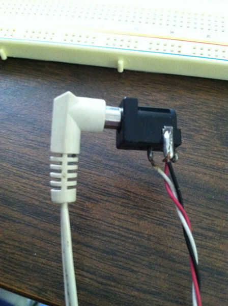 Para mis proyectos de protoboard tomé una toma de corriente de algunos dispositivos electrónicos viejos y soldar los cables rojos, negros y blanco en las puntas. El alambre extra es por si quiero utilizar el construido en interruptor que está en la toma. El interruptor podría potencialmente cambiar a batería de respaldo en caso de que la unidad viene desconectada de la unidad de pared.