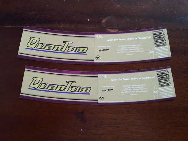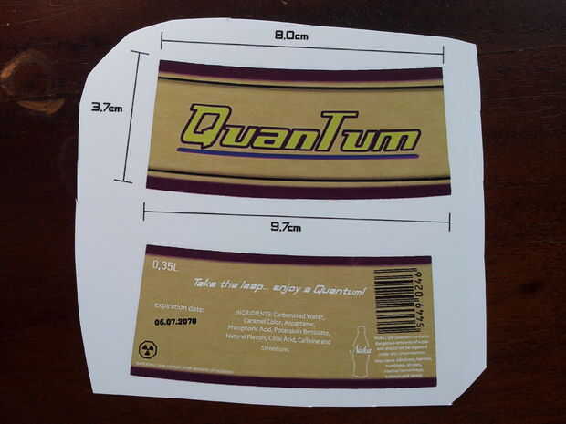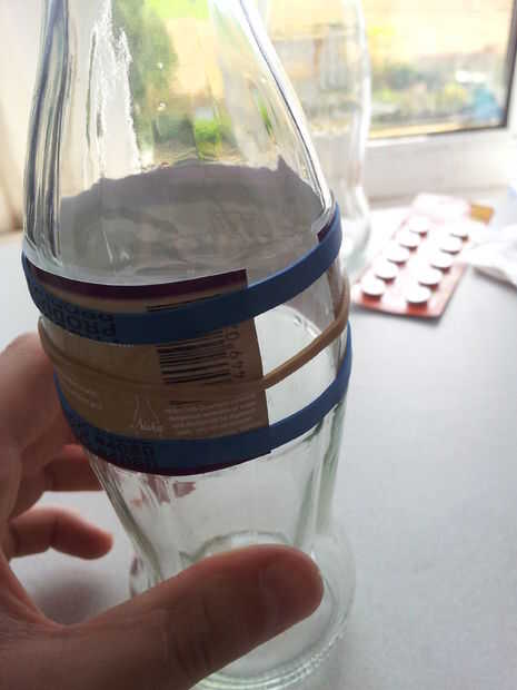 Tomar la botella, asegúrese de que esté seco (cualquier humedad arruinará la etiqueta) y conjunto de la parte inferior de la bluetak para mantenerlo constante.