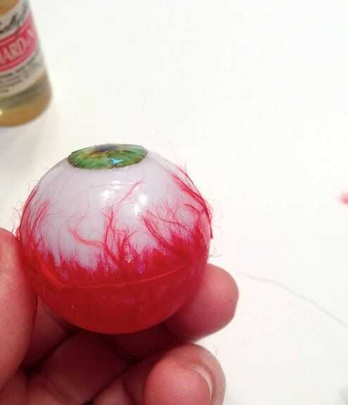 Si es necesario, utilizar sus pinzas para moverse el hilado para que los extremos de la bifurcación hacia fuera como las venas. No obtener el hilo demasiado cerca del iris, aunque; no mira a la derecha. Cuando estés satisfecho con la apariencia de la "vena", recorte el hilo sobrante de la parte trasera. Repita para el ojo entero.