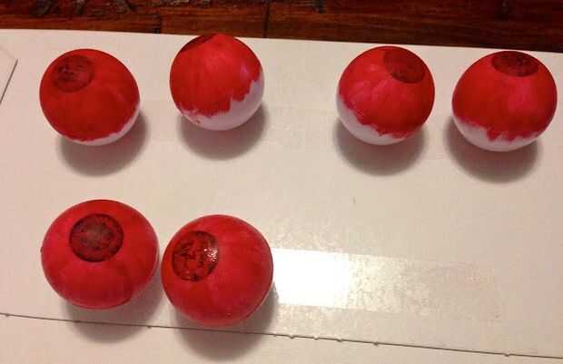 Empezar pintando algo más de la mitad de cada bola de plástico en la pintura de arte rojo. Para evitar que ruede alrededor mientras que secadas, pegué las tiras de cinta de pegar sobre un trozo de cartón: