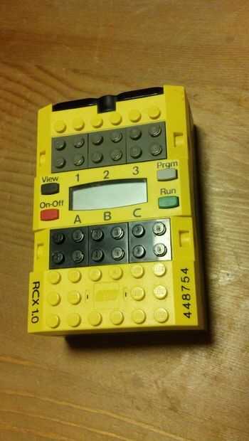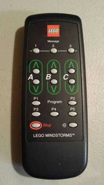 Estas fotos son de otro ladrillo RCX que compré por separado porque era un RCX 1.0 con el conector de barril externo. Esto le permite apagar el ladrillo RCX y su proyecto conjunto con una fuente externa en vez de baterías. La subasta incluyó uno de los mandos de IR del RCX que provenían de un conjunto diferente. Esto le permite controlar los movimientos y comenzar cualquiera de los 5 programas memorizados en forma remota.