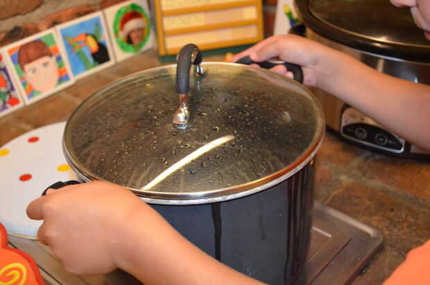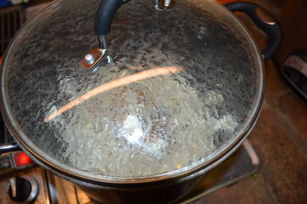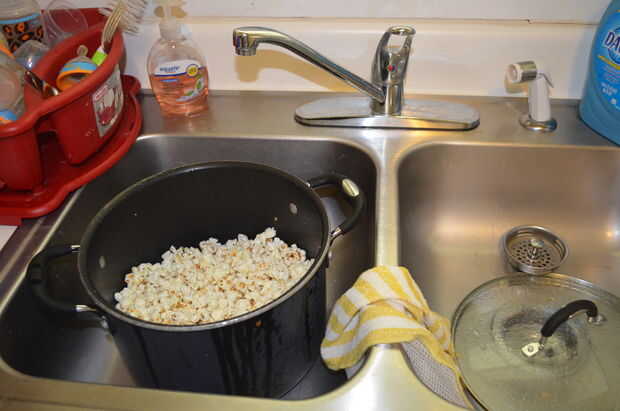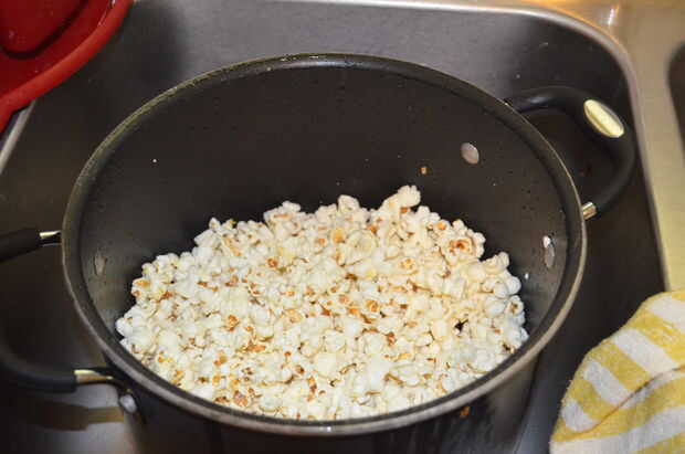 Establecido la estufa en alto y agitar la olla un poco para estirar las semillas. Cuando el aceite comienza a burbujear, empezar sacudiendo la sartén hacia atrás y hacia adelante. Las palomitas de maíz comience a reventar a un ritmo constante, sólo puede empezar a sacudir de vez en cuando. Una vez que los estallidos se ralentiza, recoja unas cuantas pulgadas del fuego. Si usas una olla del tamaño de la que estoy usando, conseguirá sobre todo a mitad de camino. Después de hacer estallar paradas, poner la olla en el fregadero para enfriarlo.
