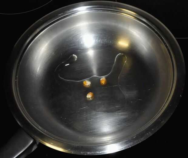 Calentar el aceite en la sartén a fuego medio. Mi estufa es marcado de 1 a 6 y uso 4. Poner 3 o 4 kernals (pips / semillas) en la bandeja antes de se calienta.
