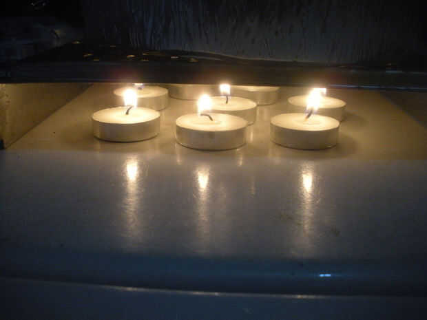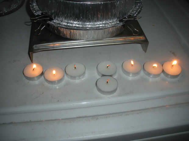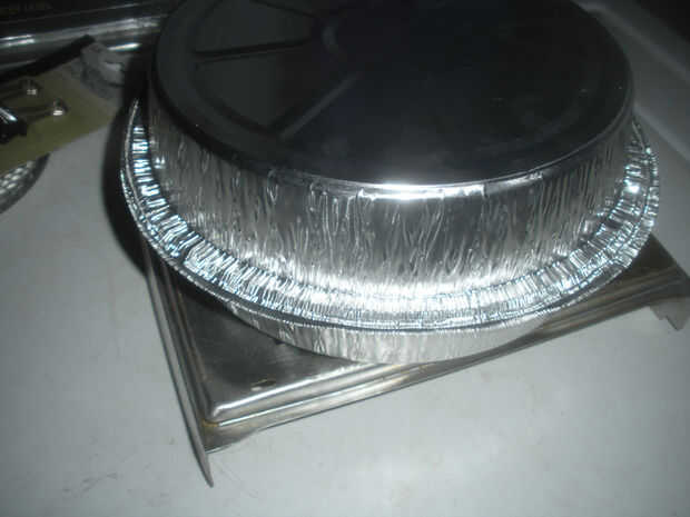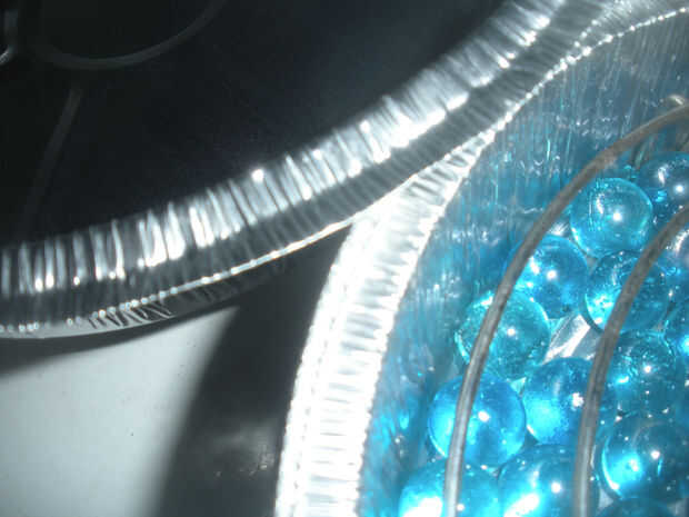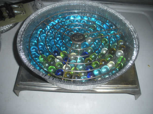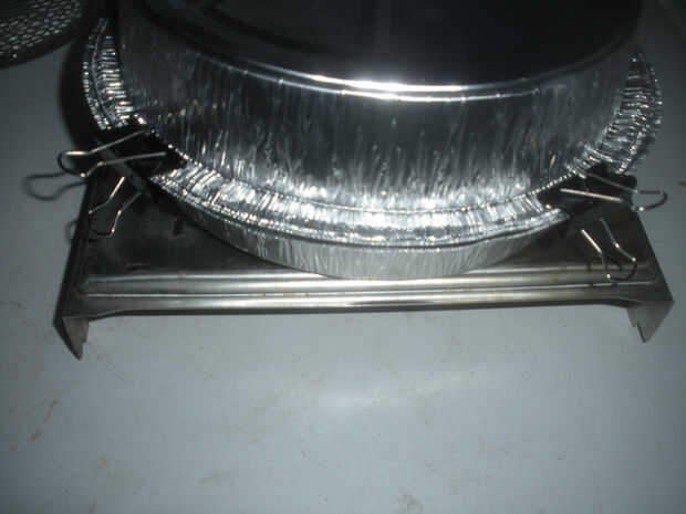 Me aplana el borde levantado de 2 de las grandes placas y llena uno con canicas de vidrio luego utiliza una bandeja de enfriamiento ya tenía en lugar de la parrilla de tienda de dólar que hubiera necesita alguna modificación y colocó el plato en otro stand que tenía en lugar de utilizar la otra parrilla y ladrillos. Coloque la otra placa en la parte superior como una tapa y asegurado el 2 con los clips de bulldiog luego encendieron velas de té 12 y que el "horno" de precalentamiento