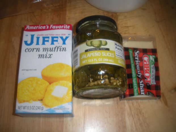 Utilicé una caja de jiffy de mezcla para molletes de maíz, queso cheddar fuerte desmenuzado y jalapeños en escabeche picados encima y vierte en uno de los platos más pequeños que había rociado abundantemente con mantequilla con sabor a spray de cocina y déjela reposar durante 10 minutos luego lo colocó en el "horno" y cerrado para arriba
