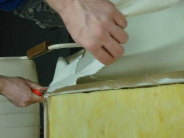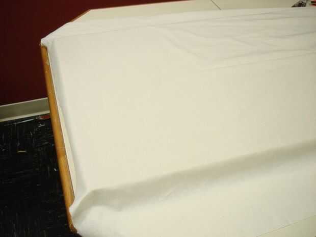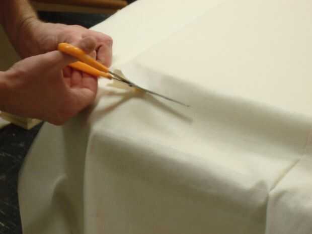 Coloque la tela para cubrir el panel. Recorte a la tela longitudinalmente de manera que cubre sobre el borde de la Junta por cerca de 1 1/2 pulgadas. No te preocupes de recorte de los bordes laterales de la tela en este momento.