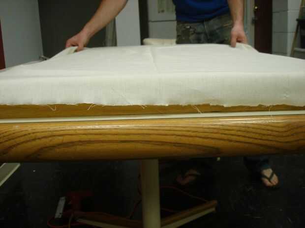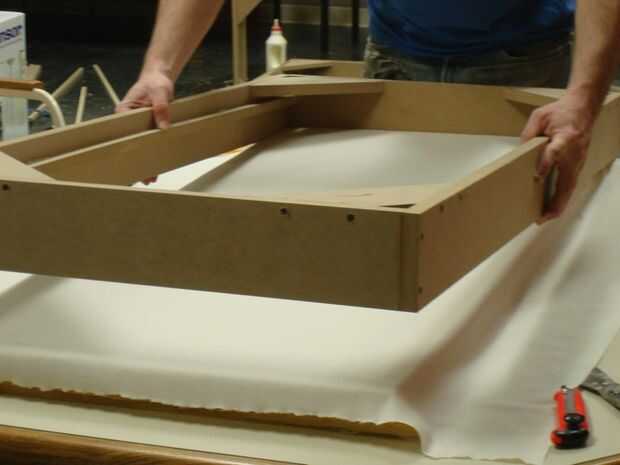 Tomar el marco boca abajo (lado de soporte arriba) y colocar sobre el tablero. Montar un lado del marco en el tablero. Asegúrese de que el tejido permanece en el lugar empuje hacia abajo de un lado a otro. Ahora debe sentarse a la mesa en el marco.