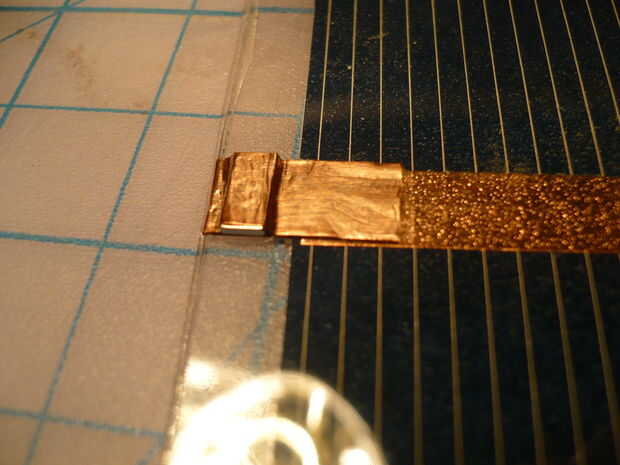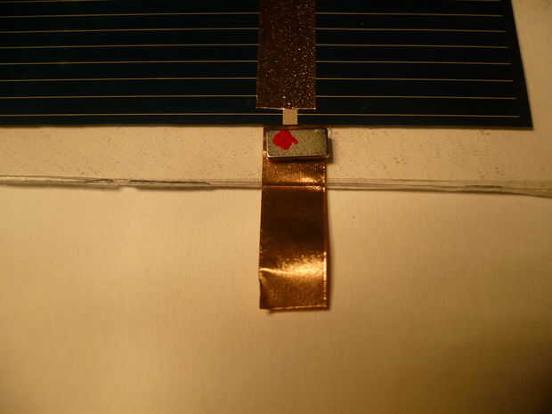 Hacer panel solar (2Volts) sin soldadura cinta adhesiva conductora y tangible de células solares.Ponga la batería solar #1 hacia abajo en el panel solar en su posición y poner a un lado de la cinta conductora en un terminal positivo y el otro lado de