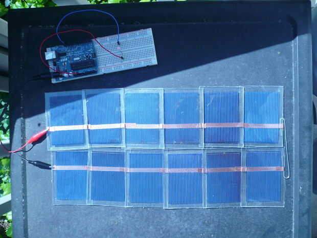 Puede ejecutar un Arduino conectando los cables positivos y negativos de 12 paneles solares en serie en el conector de barril de Arduino.