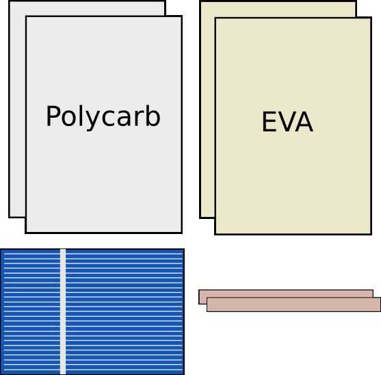 Para 52x76mm las células solares, cortadas sus hojas de 65 x 90 mm (6,5 x 9 cm). Para cada panel solar va a hacer, cortar dos rectángulos de 65x90mm de policarbonato y dos rectángulos de EVA.