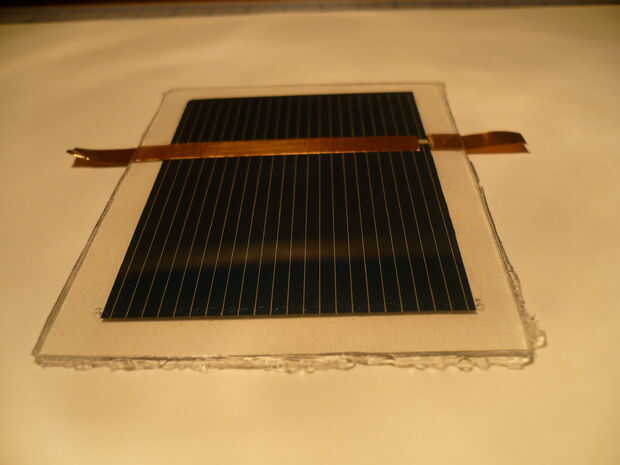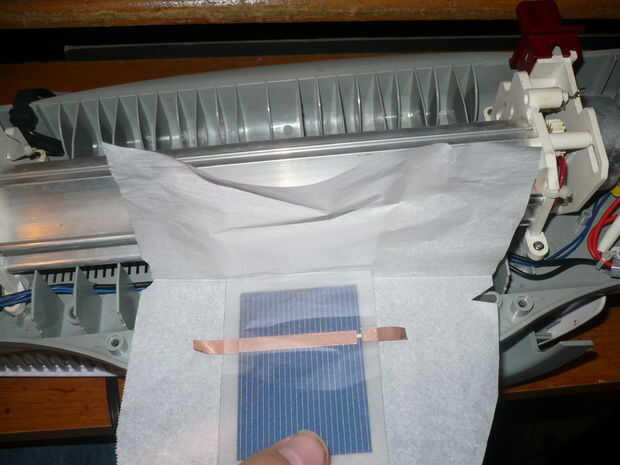 Compruebe que el panel solar es en este orden de abajo a arriba: policarbonato, EVA (golpes para arriba), la célula solar, EVA (golpes abajo), policarbonato. También asegúrese de que está pegando la cinta de cobre recto de ambos lados del panel.